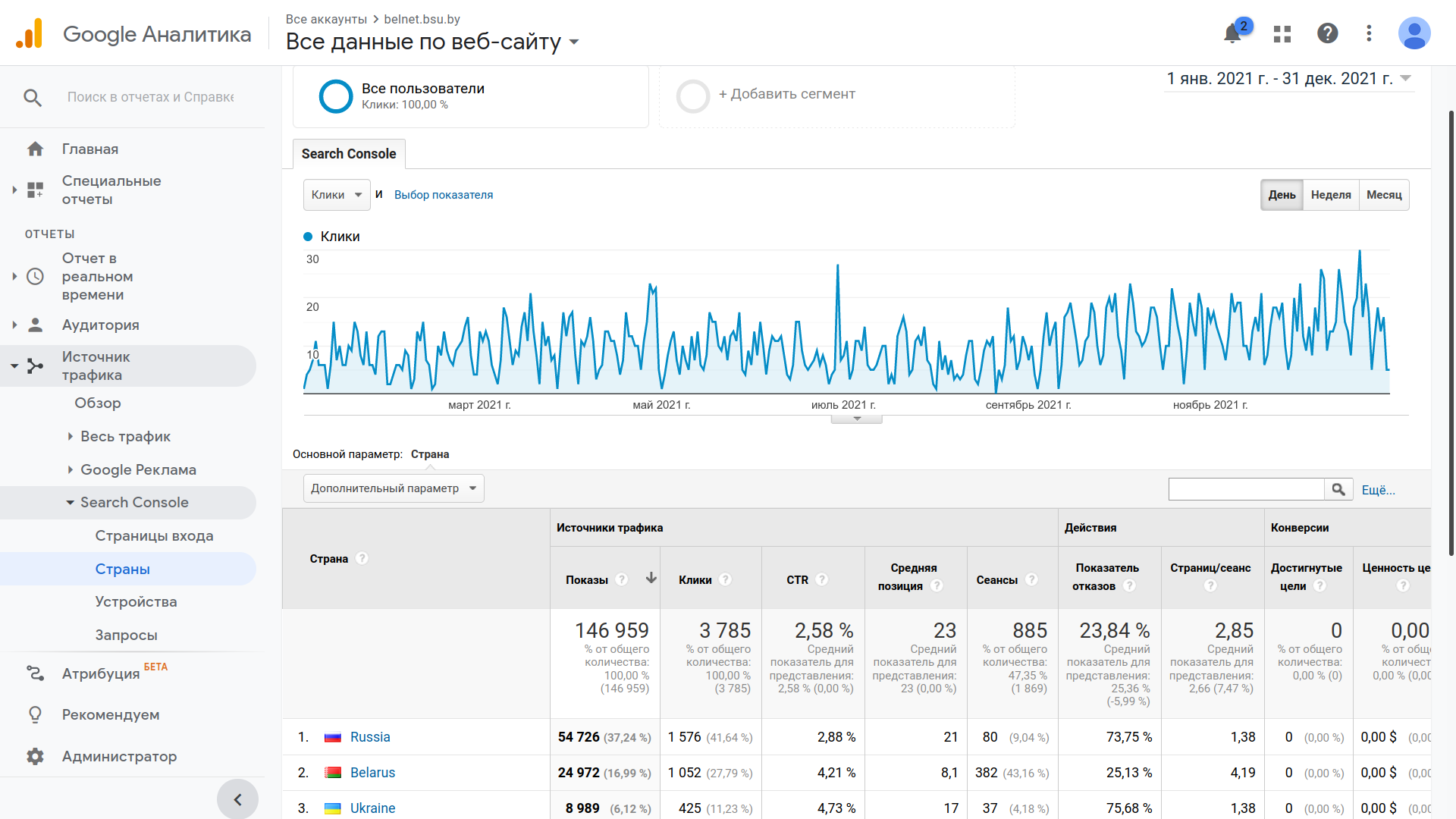 Большая часть материалов портала BelNET – на русском языке. Цель публикации актуальных мировых новостей в области ядерных знаний, свежих поступлений – со ссылками на ведущие мировые научные площадки (сайты МАГАТЭ, ЦЕРН и др.) – проинформировать и заинтересовать читателей передовыми достижениями во всех областях и направлениях ядерных знаний, предоставив им возможность в дальнейшем углубить познания в данных областях на основе оригинальных публикаций. Все материалы портала общедоступны. Единственное – для выполнения лабораторных заданий предусмотрена свободная регистрация с целью обеспечения учета результатов выполнения тестов к лабораторным работам для конкретного пользователя. Портал BelNET размещен с 2016 г. на сервере БГУ по адресу belnet.bsu.by. Все это время он функционирует без сбоев и аварийных ситуаций в режиме 24/7. В 2021 г. созданы новые подразделы в рамках раздела "Наука": Коллайдеры и линейные ускорители; Лазеры на свободных электронах; Термоядерный синтез; Передовые компьютерные технологии. В разделе «Практика» создан подраздел «Международные организации в области ядерной и радиационной безопасности». Практически каждый рабочий день публикуется информация и даются ссылки на важные новости из мира ядерных знаний. В сентябре 2021 года создан новый раздел «Научный архив». Он является прототипом специализированной информационной архивной онлайн-системы управления ядерными знаниями – инструмента для быстрой бесплатной свободной публикации в интернете в электронном архиве материалов (черновиков статей, предпубликаций, научных отчетов, технической информации и т.д.) в области ядерных знаний, в том числе в области атомной энергетики, ядерных исследований и технологий. В будущем эта архивная онлайн-система будет преобразована в Белорусский электронный научный архив для свободной публикации материалов в области фундаментальных и прикладных исследований и разработок естественнонаучного и социально-гуманитарного профиля. Количество посещений портала в 2021 г. составило 146 959 (см. таблицу-рисунок): Список стран, из которых были визиты на BelNET, см. ниже: Диаграмма-карта посещений портала BelNET в 2021 г. представлена в верхней части информации. |