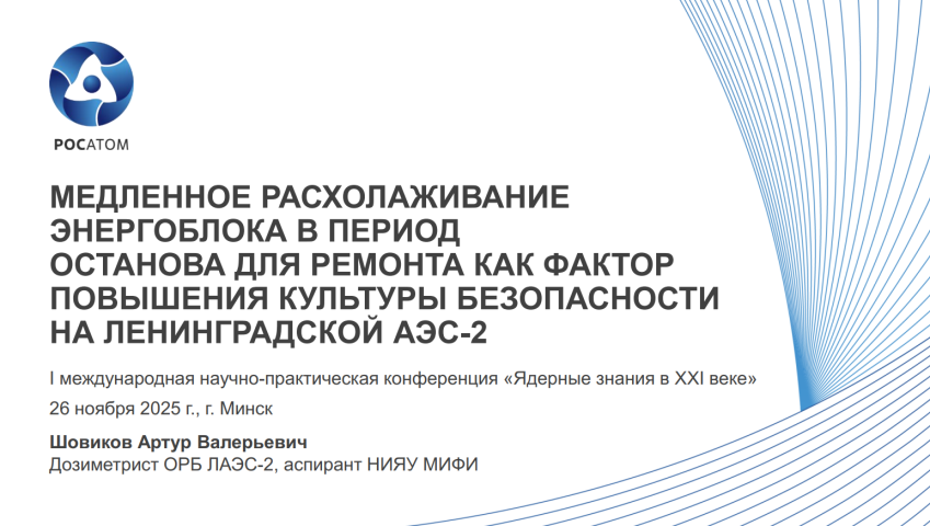Презентация доклада аспиранта НИЯУ МИФИ, дозиметриста ОРБ ЛАЭС-2 Шовикова Артура Валерьевича на 1-й Международной научно-практической конференции "Ядерные знания в XXI веке", состоявшейся 26 ноября 2025 г. на базе Института ядерных проблем БГУ (Минск, Беларусь). Доклад представлен от авторского коллектива филиала АО «Концерн Росэнергоатом» «Ленинградская атомная станция».