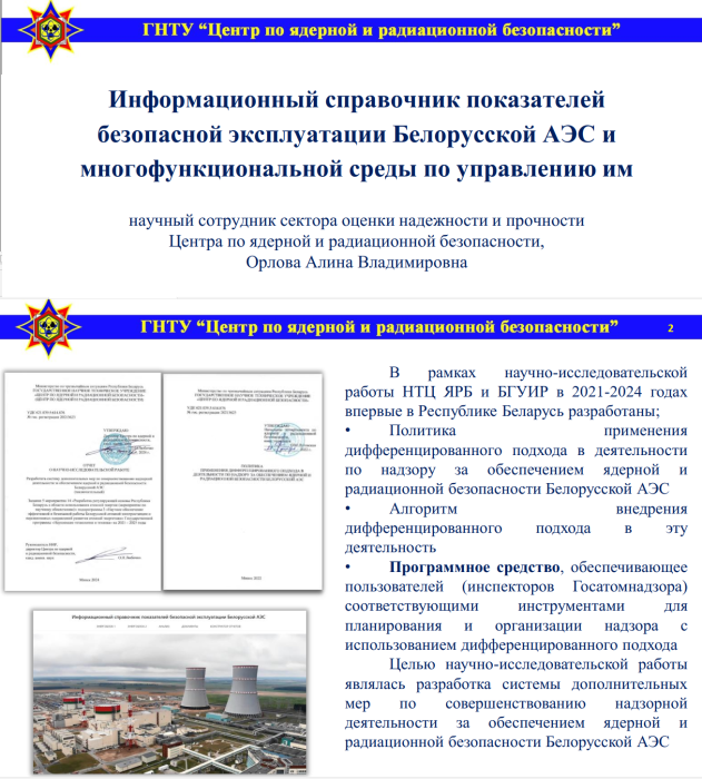 УДК 621.039.5 : 614.876 2025-11-29 Источник: 1-я Междунар. конф. "Ядерные знания в XXI веке" (26 ноября 2025 г., Минск, Беларусь) Ключевые слова: информационные технологии, менджмент знаний, ядерные знания, атомная электростанция, ядерная безопасность, справочник Презентация доклада ведущего инженера сектора детерминистического и вероятностного анализа отдела ядерной безопасности Государственного научного технического учреждения «Центр по ядерной и радиационной безопасности» Орловой Алины Владимировны на 1-й Международной научно-практической конференции "Ядерные знания в XXI веке", состоявшейся 26 ноября 2025 г. на базе Института ядерных проблем БГУ (Минск, Беларусь).