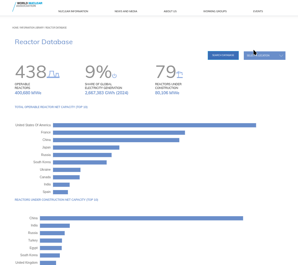 Новости Всемирной ядерной ассоциации - работает "База данных реакторов" - "Reactor Database" Продолжаем знакомить читателей с информационными инструментами, доступными на сайте Всемирной ядерной ассоциации (World Nuclear Association).