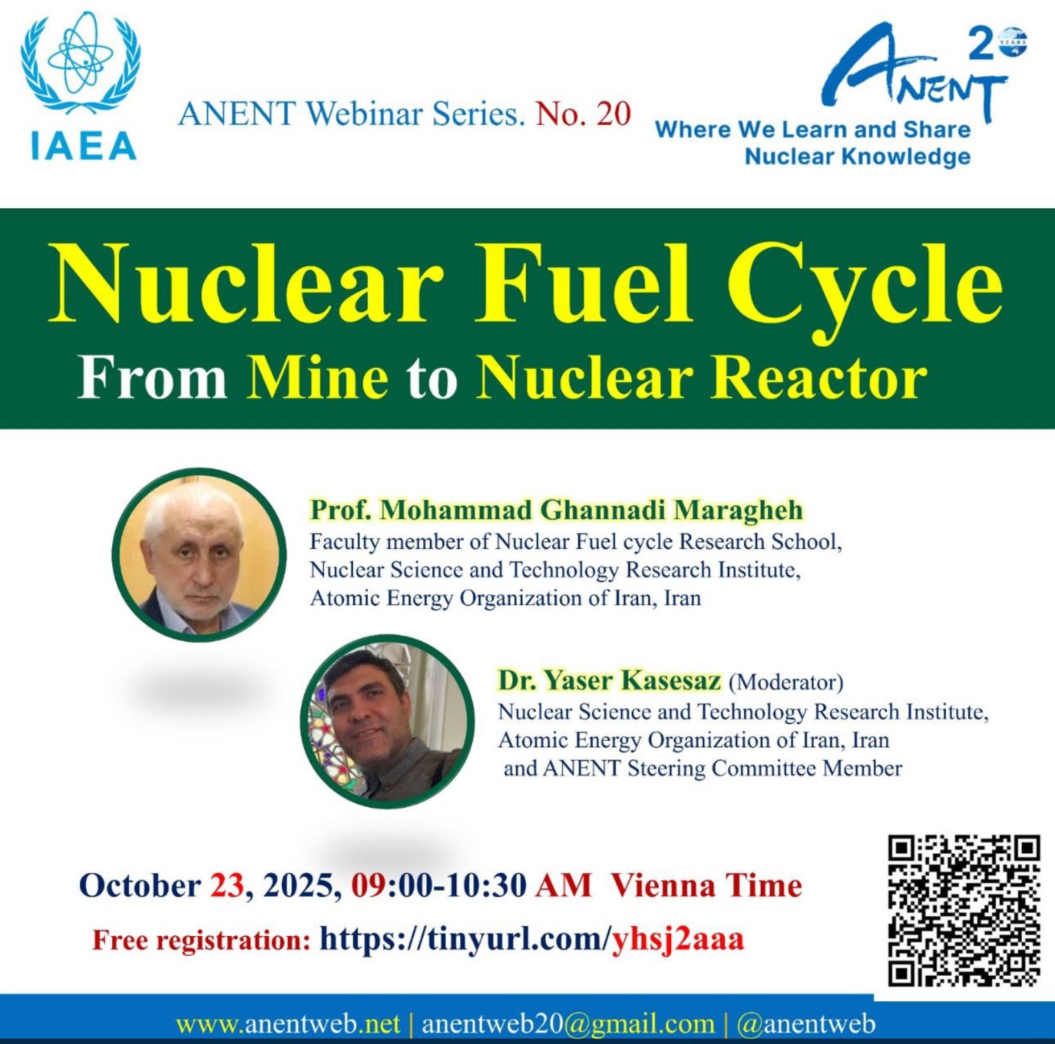 Приглашаем принять участие в 20-м вебинаре азиатской образовательной сети МАГАТЭ ANENT на тему «Ядерный топливный цикл: от уранового рудника до ядерного реактора» . Мероприятие состоится в четверг, 23 октября . Время проведения 10:00 - 12:00 GMT+3. Ре... |